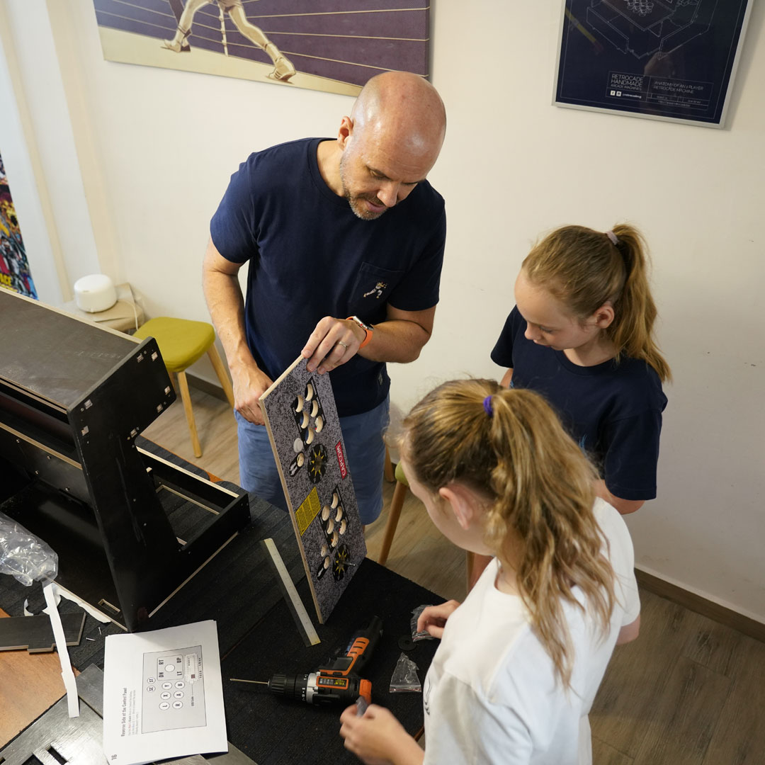 The session will guide you through assembling the cabinet, wiring the buttons and joysticks, setting up all the wires and speakers.